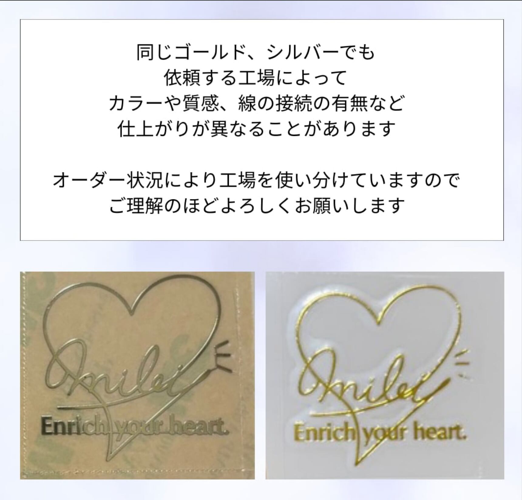・オーダー状況によって依頼する工場を使い分けております。同じゴールド・シルバーでもツヤありなしや色味、線の太さや質感など、仕上がりが異なることがあります。どの質感で制作されるかはランダムとなりますのでご了承ください。